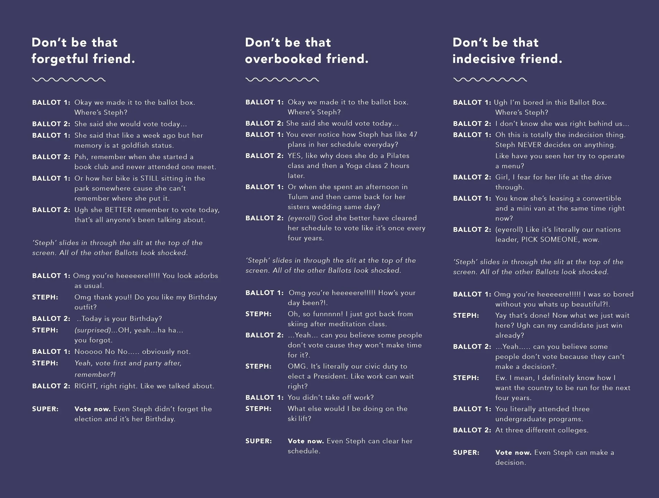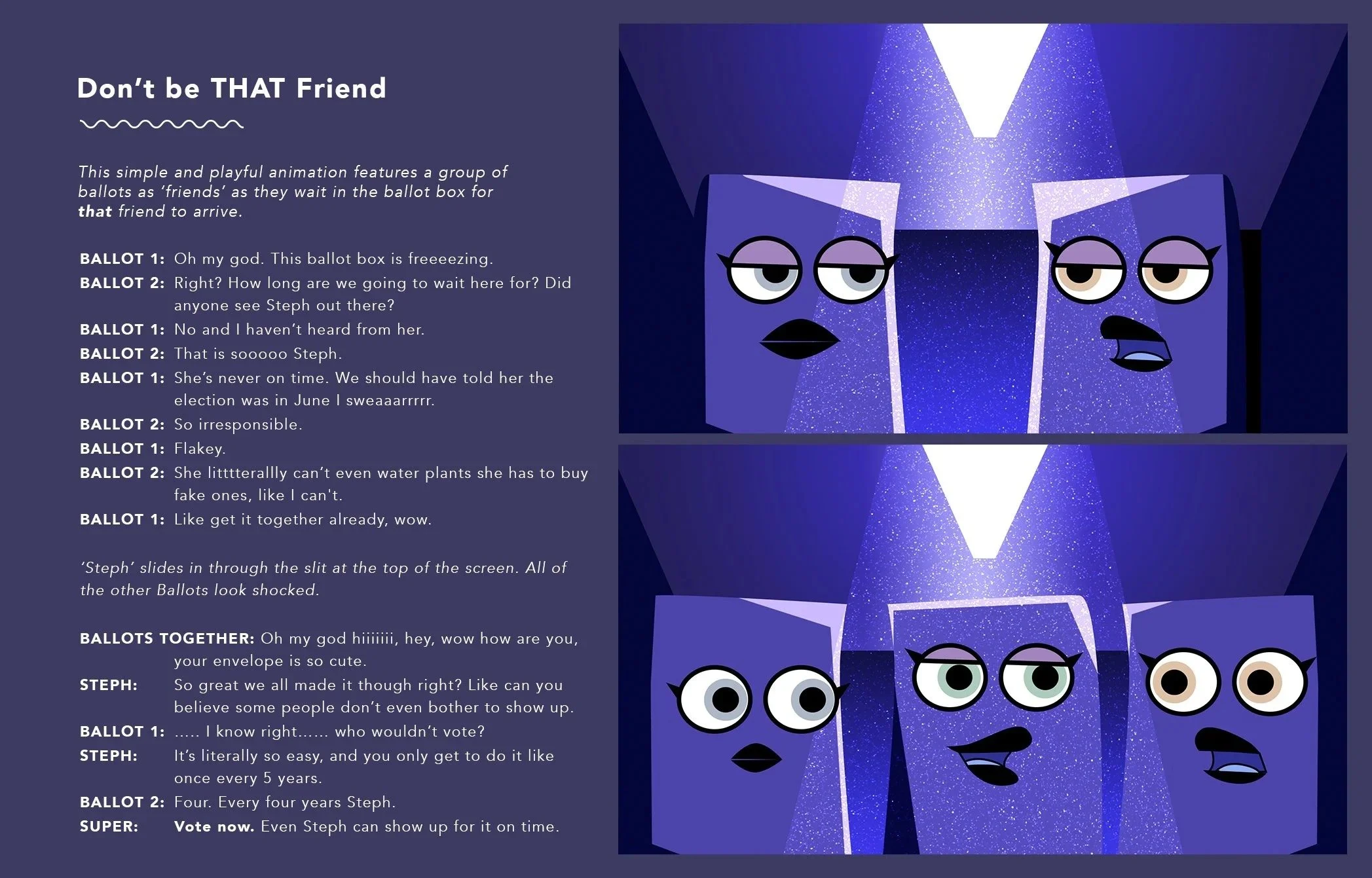 I wrote an illustrated a script that poked fun at the reasons why people make excuses not to vote. Ultimately this was not produced due to timing constraints.